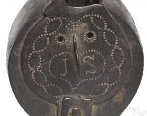 3/27/18 – How can I possibly pick just one? Coming up for auction on April 14th, 2018 is the collection of Ruth Bryson of Quarryville, Pennsylvania. It is 321 lots of things that I love! I find it a painstaking process to narrow it down to just one choice each week for just about every sale, but painted Pennsylvania folk art and Germanic decorative arts is my passion and this sale is loaded with eye candy. I just can’t pick one thing for this week so I am picking two! After much debate I decided my first pick is lot #47 the wrought iron fat lamp. This lamp is dated 1833 and is stamped “no. 81” on the flattened arm. It still retains the shaped wrought iron hanger as well was the pointed pick hanging from the delicate wire chain. The best part is that the lid is initialed “JS” within a wrigglework heart. Surrounding the heart is a fantastic wrigglework chain wreath. The Winterthur Museum collection has an almost identical example dated 1845 and numbered 130. They have identified the maker as Joseph Stanem of Lancaster and the example was donated by Jefferson and Anne Miller whose collection sold at Pook & Pook in April of 2015. What a great form with great flair and detail work, but honestly, I think it was the initials that got me!