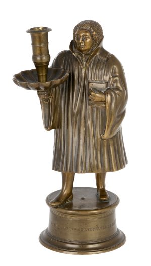 Lot 748 is extremely rare. It is the only known example of a copper alloy candlestick depicting Martin Luther, probably Nuremberg, 17th c. Luther symbolically holds the candle socket aloft, the light symbolizing his faith. In “Against the Antinomians,” 1539, in which Luther chronicled his struggles, he compared faith to the light of a candle, which the devil was continually trying to blow out, “I feared he would carry light and wax and wick away. But God again helped his poor candle and kept it from being snuffed out.” Lot 749 is a counterpoint, a bronze High Renaissance candlestick in the form of a standing satyr, from the workshop of Severo Calzetta da Ravenna (active ca. 1496 – ca. 1538). Severo specialized in small bronzes of mainly pagan subjects, which today can be found in the collections of major museums.