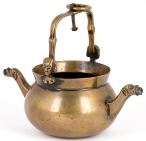 The early English group includes several fine 15th c. Three Kings form candlesticks, with Lot 735 one of only two known English detachable double-socket arm candlesticks in existence. Of Lot 732, another rare form, Christopher Bangs wrote, “this exquisite small candlestick exhibits a rare combination of austerity and adornment in its design,” its two castellated sockets on Gothic pierced arms. Acquired in England, elements of its form and alloy lean towards an English attribution, but it is classified as North West Europe on account of the shallow-lipped integral-drip base with conical skirt. A Safavid double-armed candlestick, is described by Bangs as a “tour-de-force.” Except for the sockets, it is a single casting. Its high cylindrical base, common in Near Eastern forms, directly influenced the circular-based European candle holders.