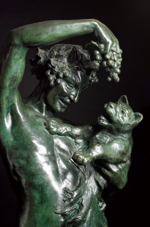 The stance of this young Dionysus is graceful and strong. The sinuous form of his pose is an s-curve. It involves the whole length of his body. In spite of the movement, the sculpture is balanced on its center of gravity like a dancer. It is a balletic pose. Pointing to the possibility of the boy being a young Dionysus are the grapes, the merriment, a pair of tiny curving horns, and the presence of his sacred animal, the panther.