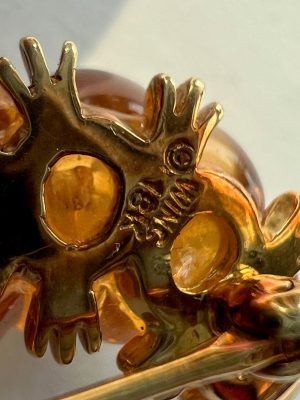 This fancy, fat caterpillar is a gem. The brooch is a design of Robert Wander (American 1943 – 2019), who was famed for his work with colored gemstones. The caterpillar is carved from a solid piece of citrine, highlighted with 18k gold, and his antennae bezel set with .01 carats of diamonds. His many legs are set on a brooch base with pin closure, stamped WINC 18K.