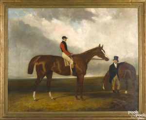 Our pick this week is Lot 360, an oil on canvas portrait of the race horse Elis to celebrate the 181st anniversary of his win at the classic St Leger Stakes in September 1836. Elis belonged to Lord George Bentinck, and is pictured here with his jockey, John Barham Day, and his trainer, John Doe. The St Leger Stakes were instituted in 1776 and still continue today, interrupted only once in 1939 with the outbreak of World War II. This portrait is dated 1838, after he retired from his two-year racing career, which boasted eleven wins out fifteen, finishing second in all four defeats. The canvas is monogrammed on the lower right by painter Abraham Cooper, a groom turned self-taught artist who later studied with animal painter Benjamin Marshall. This wonderful memoriam is estimated between 5,000 and 10,000 dollars and will be offered in our October Americana and International sale on October 7th at 9am EDT.