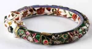 The Mughal emperors brought Persian and Asian influences to India, including the art of enameling, known as Meenakari. India had a long-established tradition of Kundan jewelry, which involves the setting of gemstones directly into molten gold foil. Kundan techniques had been present in India since the 3rd century BCE, but flourished in the Mughal courts. The two techniques combined to produce jewelry such as this bracelet, a beautiful example of Mughal style.