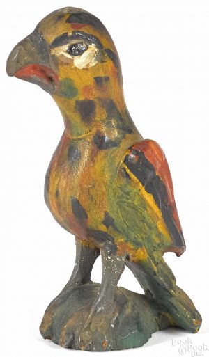 This week we would like to highlight Lot 272, a charming example of the work of Wilhelm Schimmel, a German immigrant who came to the Cumberland Valley of Pennsylvania in the 1860s. As he travelled around the valley, Schimmel repaid the hospitality of families who provided him with food and lodging by carving and painting pine animals as gifts. This glaring eaglet retains its original polychrome decorated surface, stands at only five inches high, and is estimated between 4,000 and 6,000 dollars. Wilhelm Schimmel’s eaglet will cross the auction block on October 7th at our highly anticipated Americana and International sale.