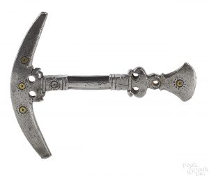 4/9/18 – Yet another week of agonizing over my pick of the week. Do I dare limit myself to just pick one thing? No, I don’t think I can. Looks like it will two picks of the week again! My first choice for this week from the collection of Ruth Bryson is lot #147. I love the whimsical artistry and painted details of fraktur. This fraktur appeals to me because of its strict uniformity of the mirror image, as well as the great use of simple color. I am drawn to the checkerboard blocks used to balance the image. I love the striped orb in the top center flanked by very precise flowers. I especially like that it is from “New Ephrata”, the place I currently call home. There are lots of things to like about this one and I hope that buyers will think so too. The second item this week could be any one of the traditional power pieces, the painted boxes, quilts, fraktur or even baskets. I wanted to bring attention to a piece that was created with not only pride and love of one’s work, but also a piece which took great skill acquired by years of honing one’s trade. Lot #89 is just that item. This is one of the best wrought iron button hole cutters that I have ever handled. From the fluid lines of the crescent handle to the shaped shaft to the curved cutting blade. Can you image the delicate hand it took to inlay the brass circles and accent them with small punches? A true labor of love.