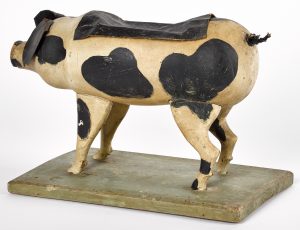 I have an announcement to make. I have managed to find the time to make a pick of the week two weeks in a row! Please be prepared for heavy snowfall this week! The auction for June 24th and 25th from the estate of Joyce Bowes Collis is packed full of picks of the week candidates. I am going through the catalog and stop on one lot after another thinking that’s going to be the piece to highlight. I turn the page and find something else. So, my picks start at dozens, get whittled down to a handful, and I then flip a coin on the final two. This week it landed on tails. It just so happens that was a fitting outcome as my choice is known for its famous tail. Lot #390 has a tail and it’s a curly-que. This carved and painted pig with an unusual canvas-covered hollow body is a whimsical pull toy. I am wondering if the purpose was for the storage of smaller toys. I could fit a lot of little toys inside. Adding to its character are great leather ears and a spotted coat. It measures 14” long and has a very nice presence. Who wants to bring home the bacon and buy this great piece of folk art.