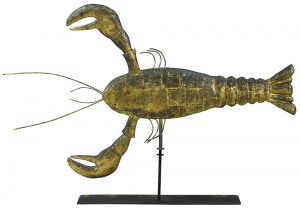 Many of you have received our catalog featuring the collection of Roland and Marilyn Kemble (and if you didn’t, you can order it here), which went out just ahead of Santa’s sleigh. For some of you the post office will drop this treat off just before the credit card bills come rolling in. As I flip through, I cannot help but to be drawn to one of the many outstanding weathervanes that the Kemble’s have put back over their many years in the antique business. I find myself looking at many iconic weathervane forms. The leaping stag I find to have particular pleasing lines, the running horse reminds me of glory days long gone and how do you get more of an American image than that of the eagle. I decided that one weathervane had everything hammered into one – lot #90, the lobster! What great lines showing well executed details and an excellent gilt surface. This one has it all! And we all know how size matters. This lobster measures 51 ½” long from the tip of the claw to the end of the segmented tail. Even the hungriest of us all would struggle just to finish one claw down at any of the memorable lobster shacks on the rocky Maine coast. So, sign up to bid and see if you can add this crustacean to your collection. Ask at the front desk if maybe they have bidder paddles in the shape of a fork, as well as one large bib.