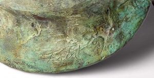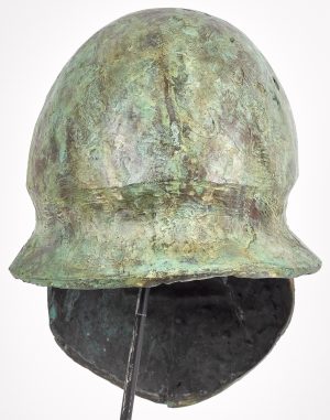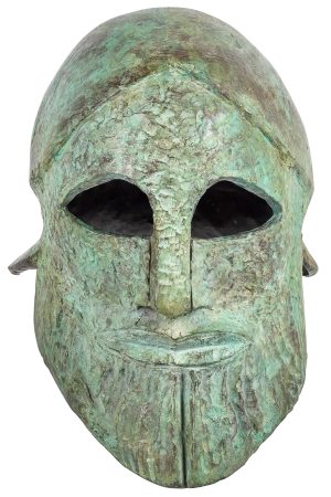 The Midas Head was created in 1989 by Dame Elisabeth Frink (British 1930-1993) as an emblem for the BBC program The Midas Touch, directed by her stepson, Mick Csaky, and presented by Anthony Sampson. With influences from the classical (see the British Museum Corinthian helmet) and the Helmet Heads by Henry Moore, Frink chose an object of ancient beauty that would have an immediate impact and be intuitively understood. The bronze helmet has a stippled surface, appearing as though viewed underwater, a found object, uncovered from the sands in Mediterranean shallows by the action of rippling waves, green with calcareous deposits, and rescued from its watery grave. Its stare is eternal; man is ever the same. The king’s armored face has a strong profile. Its outer shell has endured. The weakness of Midas is revealed by its emptiness, the result of the hollow desire of greed for money and power instead of love. Frink was distinctly concerned for the human condition. In a 1990 interview for the book, Elisabeth Frink, Sculpture and Drawings 1950-1990, Frink said “I am preoccupied with the human rights situation in the world at this moment, and this preoccupation feeds itself or finds expression in my mankind sculptures. My sculptures are either mankind or men, and they alternate or come in quite separate phases.” (p.50)