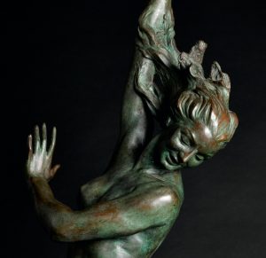 Frishmuth’s Crest of the Wave, 1928, is pure motion with a strong and clear silhouette. The motion is of falling forward, like the crest of a wave, almost at the moment of stride where both feet are unweighed. The figure’s upper body sails forward elegantly, as though with every stride she will light down on the crest of another wave.