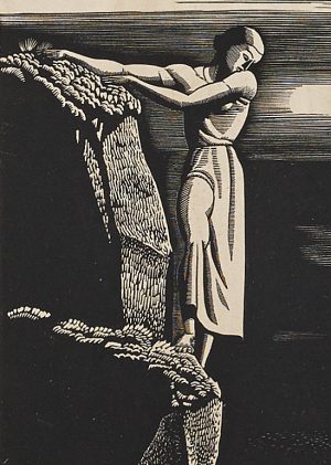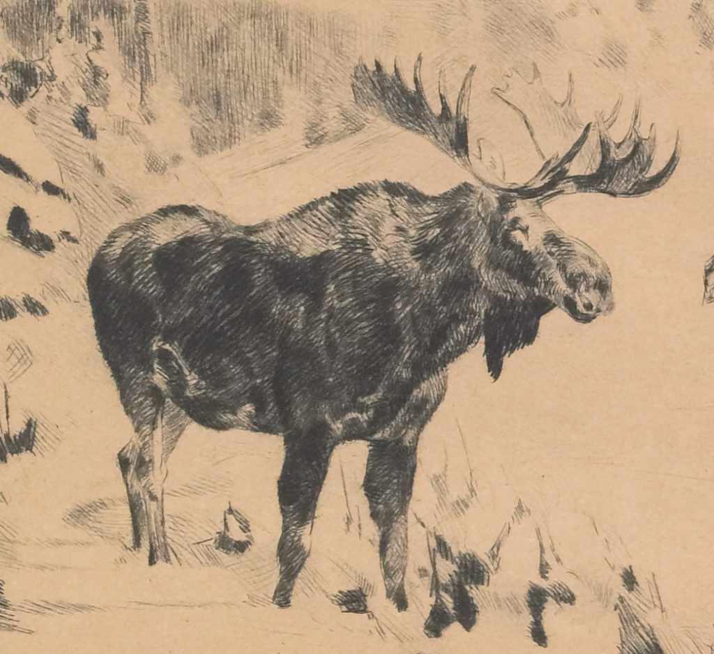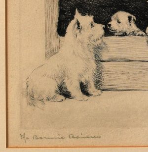Drypoint- Drypoint involves directly scratching the metal plate and differs from engraving because it displaces metal rather than removing it. Under close inspection, drypoint lines are ragged and natural as compared to neatly-cut engraving lines. The ragged edge, or “burr” on either side of the lines create a feathery look. The burr holds ink well, but gets worn down under pressure, limiting the number of editions that drypoint prints can produce. Early editions are often described as having “lots of burr.”