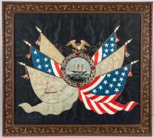 Distant seas are represented by lot 2016, a South Pacific patriotic needlework, circa 1900, with crossed flags, center wreath, and a spread-wing eagle. This good silk embroidery is an American sailor’s souvenir of a tour in the Pacific. At the turn of the century, the U.S. established naval bases in the Philippine Islands in Subic Bay, and in the Hawaiian Islands in 1908 at Pearl Harbor, solidifying an American naval presence in the Pacific. During President Theodore Roosevelt’s 1907-1909 Cruise of the Great White Fleet diplomatic tour and show of power , sixteen battleships cruised around the world making public relations stops. Fourteen thousand American sailors made the trip. In the port of Yokohama, Japan, trapunto embroidered banners such as these were sold as souvenirs. The sailors would often have their photos, ships, and ports of call incorporated into the design. Brought home and framed, the embroideries served as mementos of adventure on the high seas.