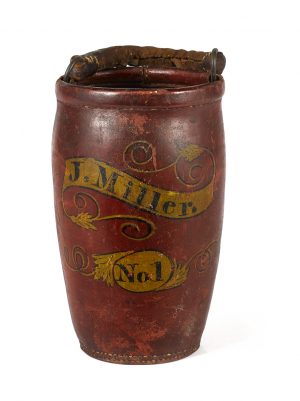 So I had this great idea of making a pick of the week for our upcoming auctions. Truth be told I had that idea over a year ago! I am making it my New Year’s resolution to implement my grand plan and make it come to fruition. I promise the idea won’t get stored with the treadmill, the food processor used to make healthy tofu and spinach shakes or the new alarm clock set for 5:00 AM so I could wake to do Yoga before the sun rises. My pick this week is from the collection of John Rexroad of Madison Connecticut. Mr. Rexroad’s collection is very diverse and spans many collecting fields so I had plenty of choices. My pick is lot #191, the painted fire bucket. The reason behind my pick is for one I love painted Americana. There is nothing like the individuality of early American history with someone’s personal touch and flare. I think a painted leather fire bucket is a must have for antique collectors. With a changing market, functionality and eye appeal have become much more important. How great does a fireplace look with a painted fire bucket hanging from a wrought iron hook. Even better still, imagine if your family name was Miller. The story you could weave about an early family patriarch saving the town by dousing a flame with this one red bucket!