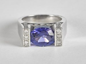 Now consider the 4.60 carat oval-shaped tension-set tanzanite; the boldness of the platinum mounting and the hefty glittering gemstone working in active opposition to the perilous balancing act of the tension setting. The stone is a sensation. Tanzanite is known for its pleochroic effect, meaning its color will appear to change when viewed at different angles. Shifting from royal blue to bluish-violet to vibrant purple, this chameleon stone craves attention and drama. Not to mention the thirty-four diamonds which frame the tanzanite from all angles.
