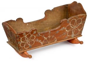 Over two hundred years ago, in Lancaster County, Pennsylvania, an artisan known as The Compass Artist produced colorful, intricately decorated furniture and objects in a distinctive style. Research has revealed the pieces were owned by German Protestants of a variety of faiths, in an area on the present-day border of Lancaster and Lebanon counties encompassing the Cocalico Valley. While it is unknown if the Compass Artist was an individual or a group, the body of work produced is very cohesive. Two excellent examples will be featured at Pook & Pook on June 24th, in the Estate of Joyce Bowes Collis. Lot 123 is a poplar dome lid box, decorated with red and white pinwheel flowers on a blue-green ground, and lot 382 is a doll cradle with floral decoration on a salmon ground. The Compass Artist laid out designs using a carpenter’s scribe compass, inscribing patterns into the wood to be later painted. These geometric indentations can be seen and felt on the surfaces of both dome lid box and doll cradle. The perfect alignment of pattern on the box from lid to front was obtained by inscribing the top before bending and attaching to a completed, inscribed and dovetailed base, then sawing the whole thing in half. Finally, the paint would be applied following the outlines, and painted in freehand between the designs. No two patterns by the Compass Artist are identical.