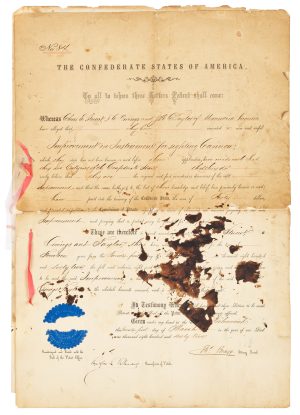 The American Civil War is considered the first modern war, witnessing rapid advancement in military technique and technology. Lacking the North’s depth of military resources, it was crucial for the Confederacy to innovate. At inception in 1861 the Confederacy established its own patent office to facilitate and reward innovation. Rufus Rhodes, a New Orleans attorney who had worked with the U.S. Patent Office, was appointed Commissioner. Rhodes would be the only serving Commissioner.