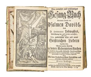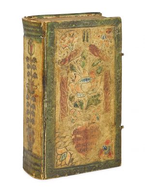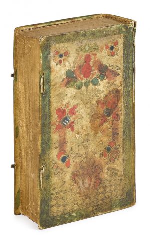 When I sat down with the Flacks to look over the catalog before it went off to the printer, Paul remarked that his favorite fraktur artist was Andreas Kolb. I too find Kolb’s work superior and I’ve laid out my share of fraktur artists over the past decade creating catalogs for Pook & Pook. I love the whimsical quality of his flowers and creatures as well as his use of contrasting dark and light colors in his art. Two lots by Kolb are set to cross the auction block on October 13th at The Collection of Paul & Rita Flack, both watercolor and ink songbook examples by the Lehigh County, Pennsylvania Mennonite school teacher (active 1784-1810). So, my picks of the week are lots 84 and 218. The first, a rare hymnal with a tooled and pigmented leather binding yields not one, but two bookplates inside its cover. The first is a tulip blooming out of an inscribed heart. In the corner, a quirky little face emerges. The adjacent bookplate reveals clumps of berries above the text detailing the recipient’s name.
