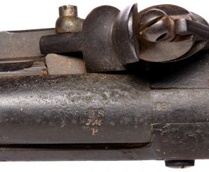 A recent crossing of the the auction block in our March 25th Firearms, Militaria, and Sporting auction was a fine, untouched example of a Nathan Starr model 1816 musket. This particular example was made for the Delaware militia, with a stamp “US JM P”, signifying it was inspected by Justin Murphy, a US Inspector of contracted arm. The firearm bears two date-stamps reading 1831, making this the final year of Justin Murphys term, who had been inspecting arms for the US since 1818.