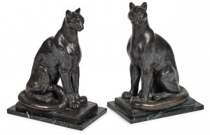 Lot 860 Pair of Pumas (1950) “William Zorach was commissioned by a Mrs Gladwin of Santa Barbara to make a pair of life-sized pumas for her garden. After studying two magnificent specimens in the Staten Island Zoo he modeled the pumas in clay and cast them in bronze. He also made a large pair of pumas in stone that were cast into bronze. One of the large stone pumas is in the Philadelphia Museum of Art’s Azalea Garden. Like ancient echoes of the Late Period Egyptian bronze Gayer-Anderson Cat (ca 664-332 BCE, British Museum), this pair of household guardians regard each other with a graceful nod. With their quiet strength and dignity, they could well be idols of the goddess Bastet, whose form was originally that of a fierce lioness- before being compacted into the shape of a domestic cat. Protector of all of Lower Egypt, the king, and the Sun God Ra, these pumas, if asked nicely by human supplicants performing the proper rituals, will nobly guard a new kingdom.