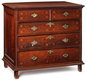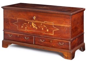 The ultimate form of Chester County furniture is the spice chest. Inherited from English furniture, “By the early 1700’s, the form had generally ceased being made outside of Pennsylvania, where it continued to flourish among Quaker families in Chester County.”14 These were inlaid with the most elaborate patterns, with pinwheels and compass stars, many with initials that can be traced to their original southern Chester County owners. William and Mary style turned ball feet on spice boxes otherwise in the Queen Anne style is typical of the conservative Chester County makers. Secret drawers are a favorite feature, spice chests actually functioning as diminutive valuables chests. Displayed in the home, they often bore inlaid dates and initials, reflecting their owner’s status. Lot #53, a cedar spice chest ca. 1725, is rare for being decorated on all sides, and is likely an early precursor made in Philadelphia. It opens to a nine-drawer interior, with a hidden tenth drawer. Its “flowerpot with tulips inlay (a motif common in painted Pennsylvania Dutch dower chests) is unusual for line and berry, which did not use objective representation.”15