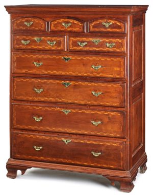 Herringbone inlay is “rarer than the berry and line inlay.”18 Schiffer’s study revealed it was sometimes combined with line and berry, sometimes with marquetry birds. No pieces bear dates, but the cases appear to be from the first half of the 18th c. Lot #42 has classic Chester County form, with three arched drawers over two, formerly secured with “Quaker” or spring locks, and raised panel sides. A brilliant herringbone pattern borders each drawer. Another technique long out of fashion elsewhere is found on three of the four lower drawers, which formerly hung on side runners. “This continued use of early forms and stylistic details parallels continued use of line and berry inlay in Chester County throughout the 18th c. and was part of the same vernacular tradition.”19 Far from being simply anachronistic, Chester County cabinetmakers were creating their own localized form of the tall chest. Octorara Valley furniture is another distinctive local form, from the western boundary of Chester County. The Queen Anne high chest, Lot #57 with the typical tall, tapering ogee feet with closed circle cut out, and raised panel sides.