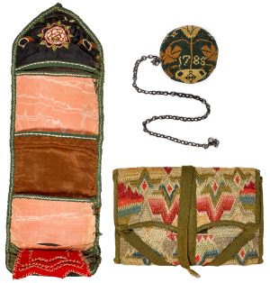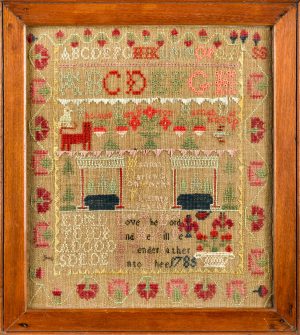 Owner Debra Pook explains what distinguishes an important Chester County, Pennsylvania needlework grouping of sewing articles. Made by Hannah Darlington, ca. 1785, each piece bearing the maker’s name or initials, included are a rollup sampler pinball dated 1785, initialed HD, with potted tulips and flowers, a vibrant flame stitch wallet inscribed HD 1785, an intricate flame stitch rollup pin case inscribed H. Darlington 1787, and a cross stitch silk and wool on linen sampler with floral border inscribed Hannah Darlington work this in 1785. Provenance: Purchased from Vernon Gunnion in 2003 as a Christmas present from Trish to Don. “This is a wonderful example of Chester County needlework. These very early sewing articles are all made by the same hand, by Hannah Darlington, from the well-known, wealthy Quaker Darlington family. She created the fabulous flame stitch wallet in wool in 1785, and rollup pin case in silk in 1787. The rollup pinball is remarkable for being crowned with a stitched sampler. They are beautifully and expertly done and have survived in fine condition.”