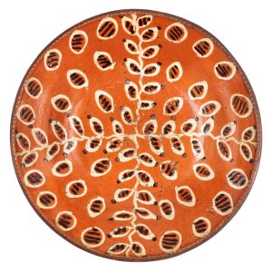 Two visually arresting chargers include a rare Pennsylvania or Maryland example with a cream and brown slip decoration of two crossed vines of striped leaves with berries, on a background buzzing with striped ovals. The second is a Pennsylvania charger with yellow and green slip geometric decoration resembling crossed boughs. The transparent green glaze overlaps the yellow, the shadow on the field producing a pronounced three-dimensional effect.