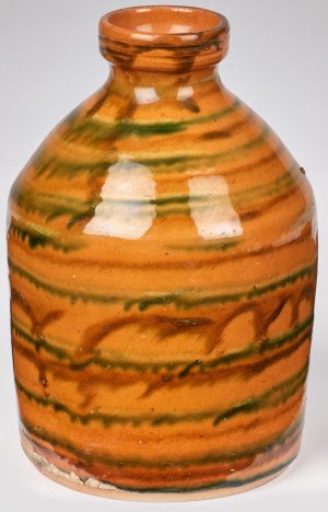 In addition to works by Pennsylvania potters John Bell and Jacob Medinger, a scarce New York redware bottle has a known maker. Attributed to the early Mormon leader Heber Kimball, an amber bottle has blurred concentric bands of green and brown, and a glassy lead glaze. In the 1820’s Kimball worked as a potter in Mendon, purchasing the works from his brother. Soon after creating this bottle, ca. 1830, Kimball was baptized and headed west, eventually becoming one of the first pioneers to settle in Salt Lake City. Another of his bottles is exhibited there in the Museum of Church History.