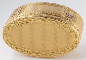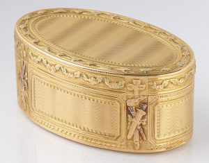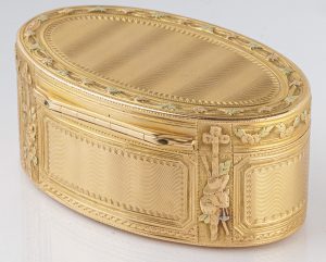 Snuffboxes and snuff were important social indicators. Taking snuff evolved into elegant solitary acts, in which was displayed as much style and grace as possible, and group activities, where “the act of handling the box and offering snuff evolved into a secret code, the ‘language of the tabatiere.’”(Victoria & Albert Museum, Gold boxes) Pity the poor lover of Carl Alexander von Lothringen, who had to interpret the signal recorded in his diary that “taking snuff, and then pretending to flick traces of it from his coat or fur tippet, was his way of asking his beloved whether she would attend a ball.” (V&A, Gold boxes) The gold boxes were also given on occasions of marriage and in friendship amongst powerful and influential people, with many examples known to have been owned by historically important 18th c. figures.